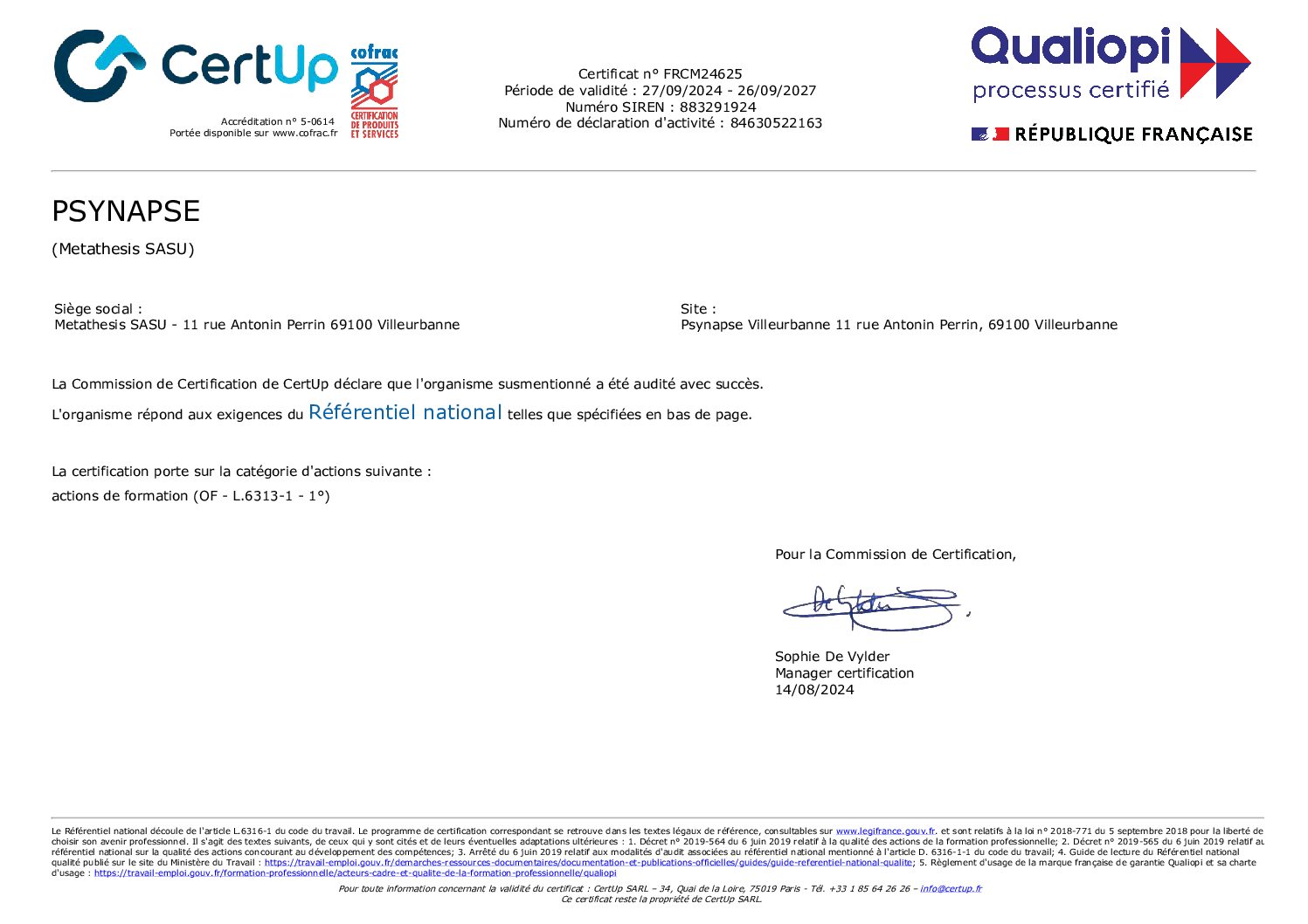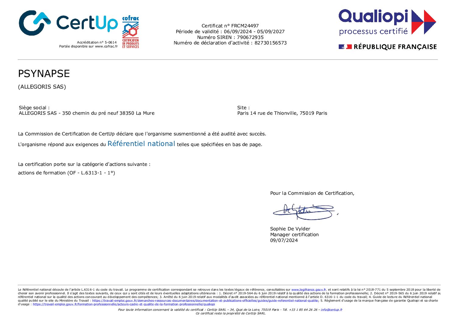 L’obtention de cette certification démontre l’investissement de notre équipe dans la qualité de nos prestations de formation, qui répondent aux exigences du Référentiel National Qualité édité par le Ministère du Travail.